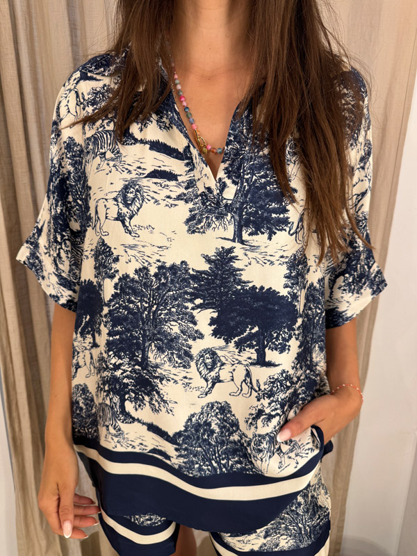 Kurzarmbluse – Toile de Jouy in Dunkelblau