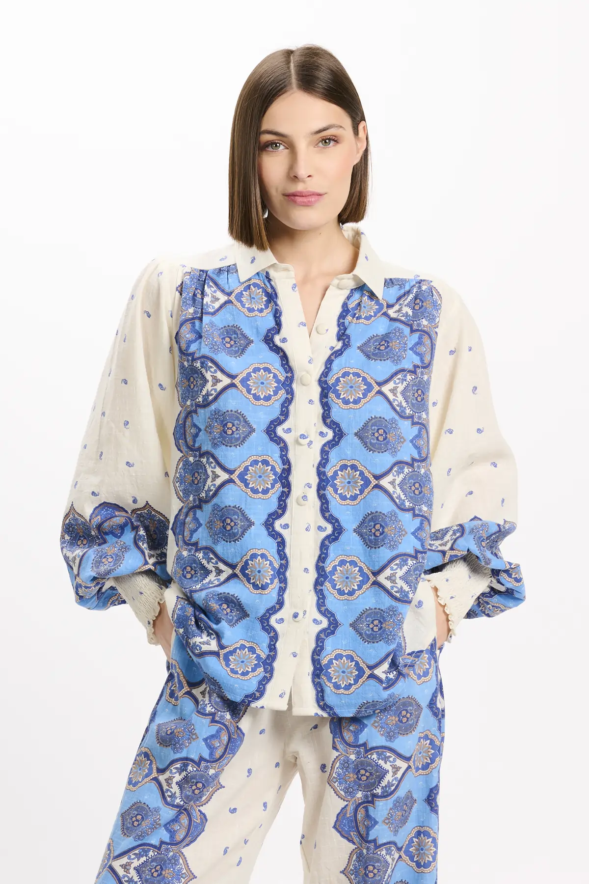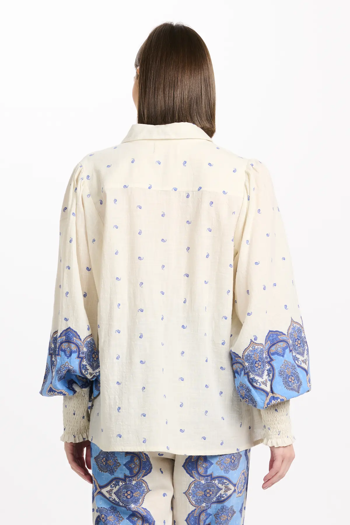- Farbe & Details: Eleganter Paisley- und Kaschmir-Print in harmonischen Blau- und Beigetönen auf einem soften Ekrú-Hintergrund. Klassischer Blusenkragen mit feiner Knopfleiste aus edlen Perlmuttknöpfen. Lange Puffärmel mit gesmokten Manschetten setzen feminine Akzente.