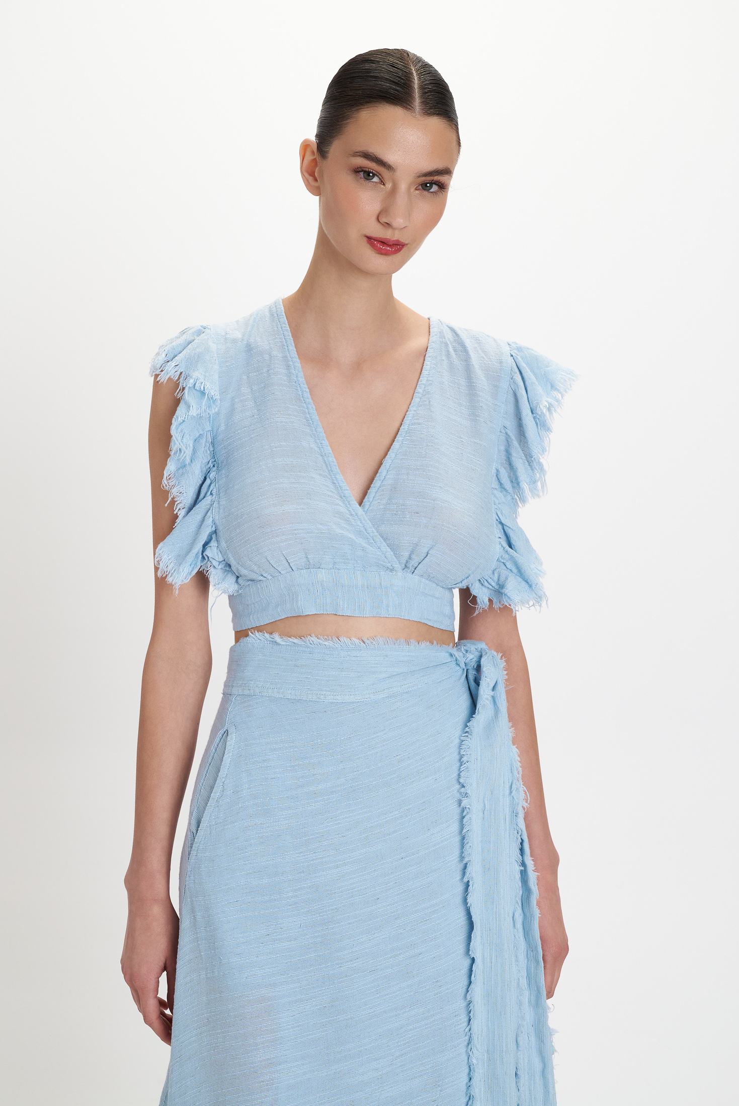Zarter Hellblau-Ton mit natürlicher Struktur. Das kurz geschnittene Top verfügt über einen femininen V-Ausschnitt in Wickeloptik und kurze, leicht ausgestellte Ärmel mit fransigen Abschlüssen, die dem Design eine moderne, lässige Note verleihen. Ein elastischer Bund sorgt für eine bequeme Passform und betont die Silhouette.
