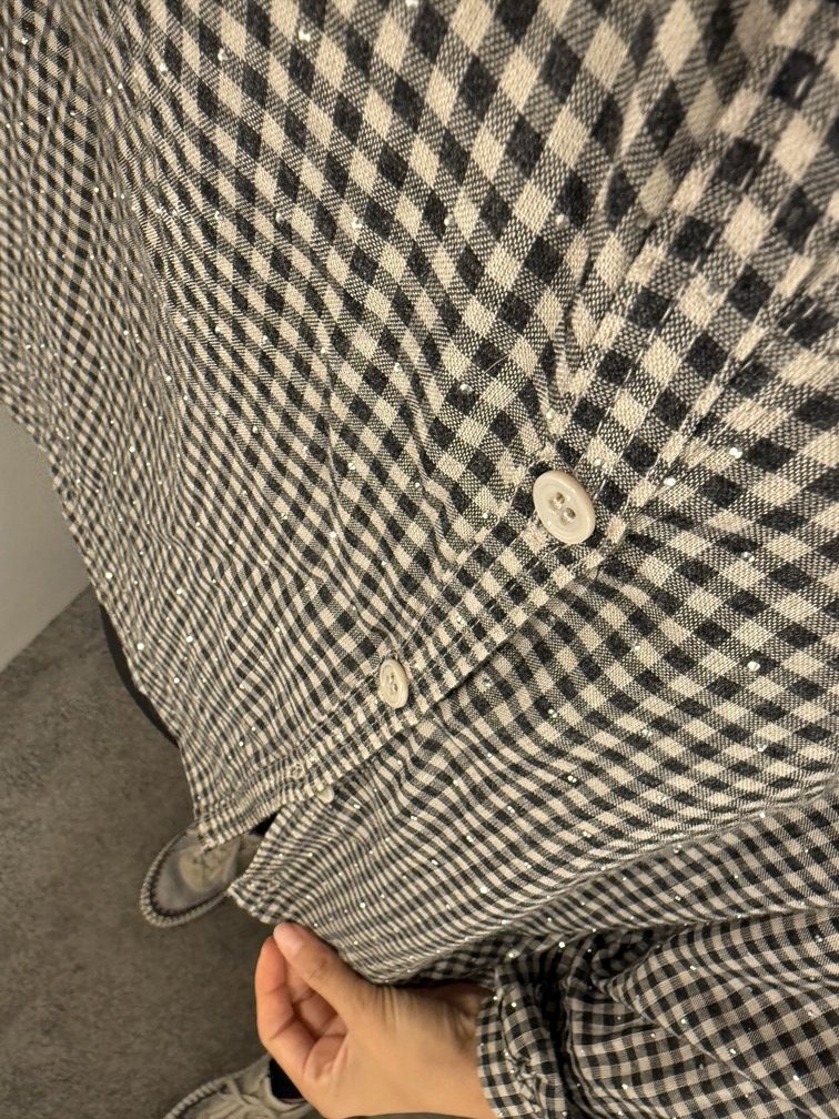 Artikeleschreibung: Baumwoll Blue karriert mit länzenden Steinchen versetzt. Dünner Stoff, angenehm zu tragen.
