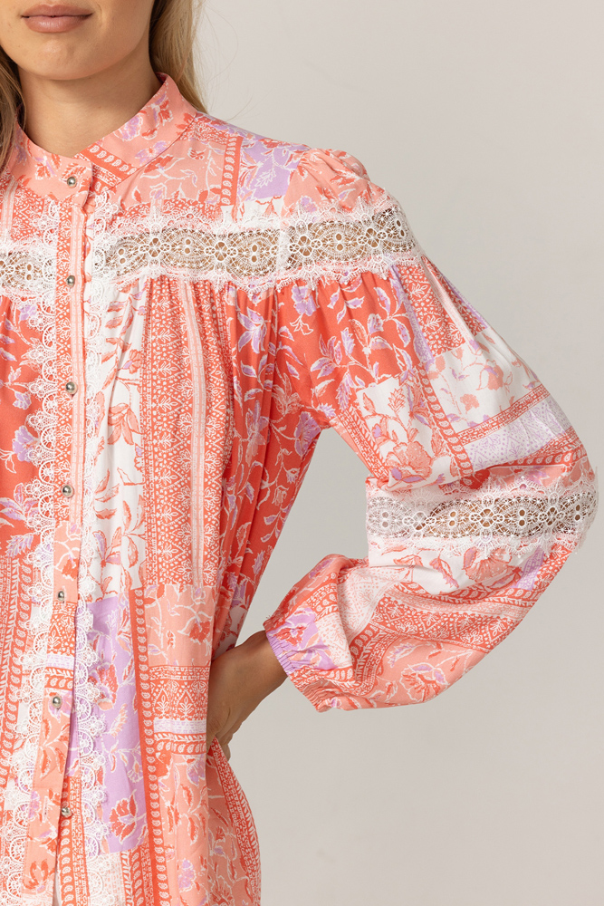 Leichte Boho-Bluse von Miss June mit Knopfleiste, Ballonärmeln und verspielten Pilz-Details.