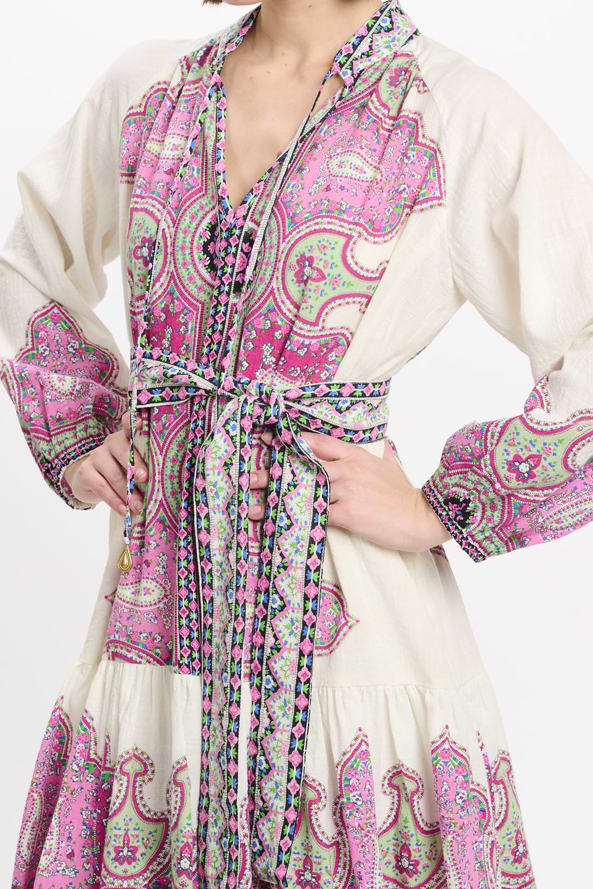 • Farbe & Details: Edler rosa Paisley-Print in harmonischer, symmetrischer Platzierung auf hellem Grundton. Tunesischer V-Ausschnitt mit dekorativer Bordüre. Lange Puffärmel mit elastischen Manschetten sorgen für eine romantische Silhouette. Abnehmbarer Bindegürtel ermöglicht zwei Tragevarianten – locker fallend oder feminin tailliert. Zarter Rüschensaum am Rockabschluss rundet den Look ab.