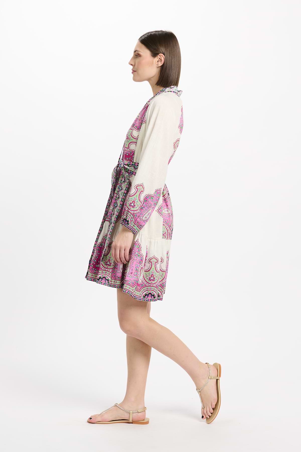 Miss June Isabella Kleid aus strukturierter Baumwolle mit rosa Paisley-Print, Puffärmeln und abnehmbarem Gürtel. Bohème-Chic, feminin und vielseitig tragbar.