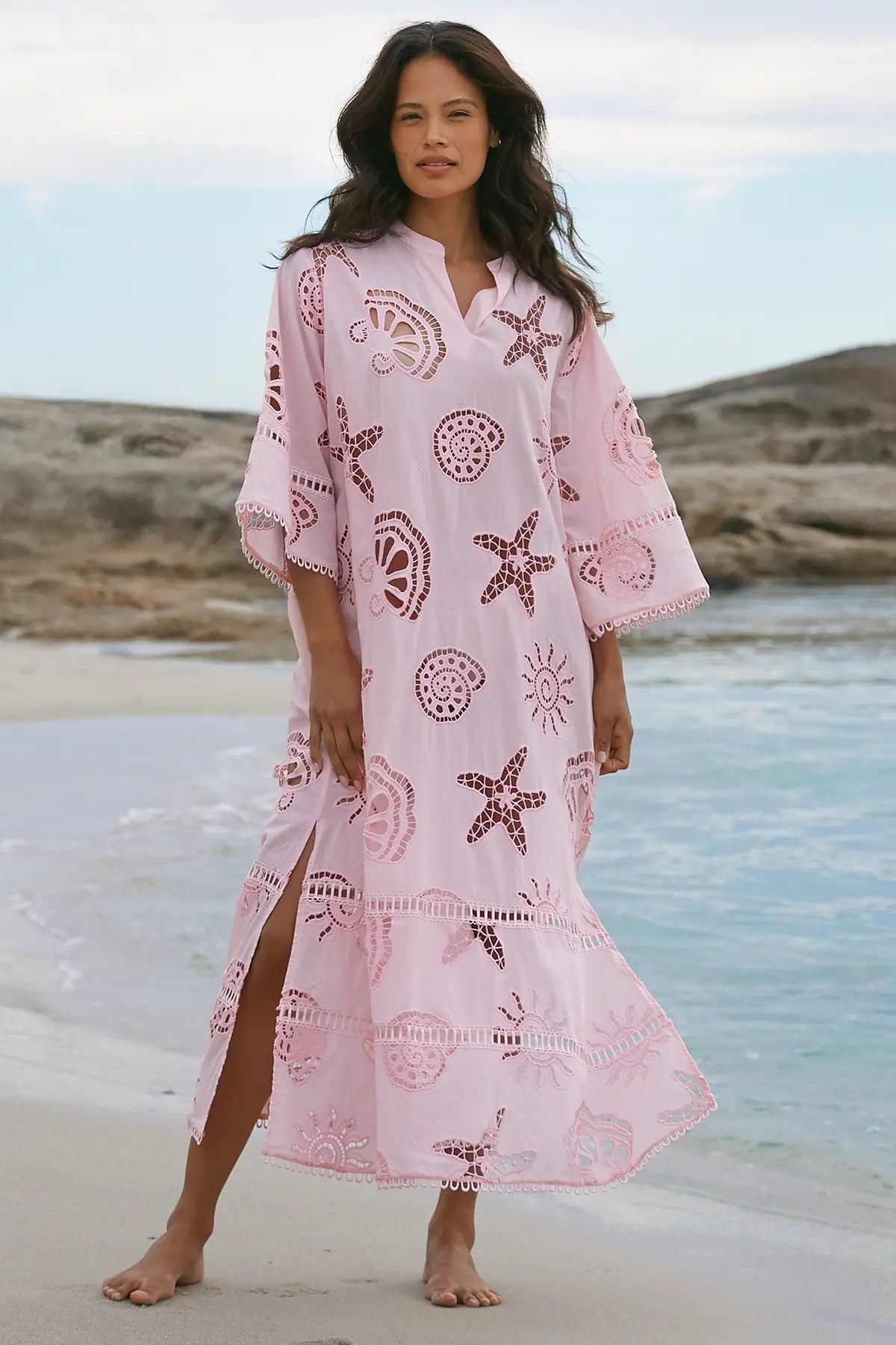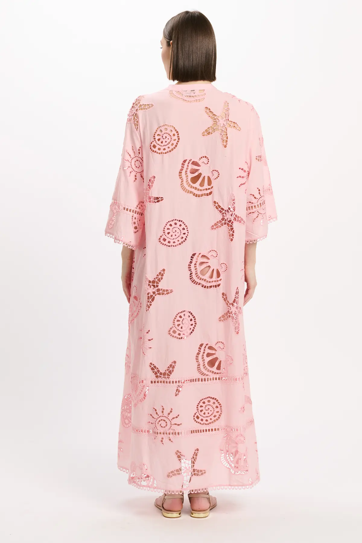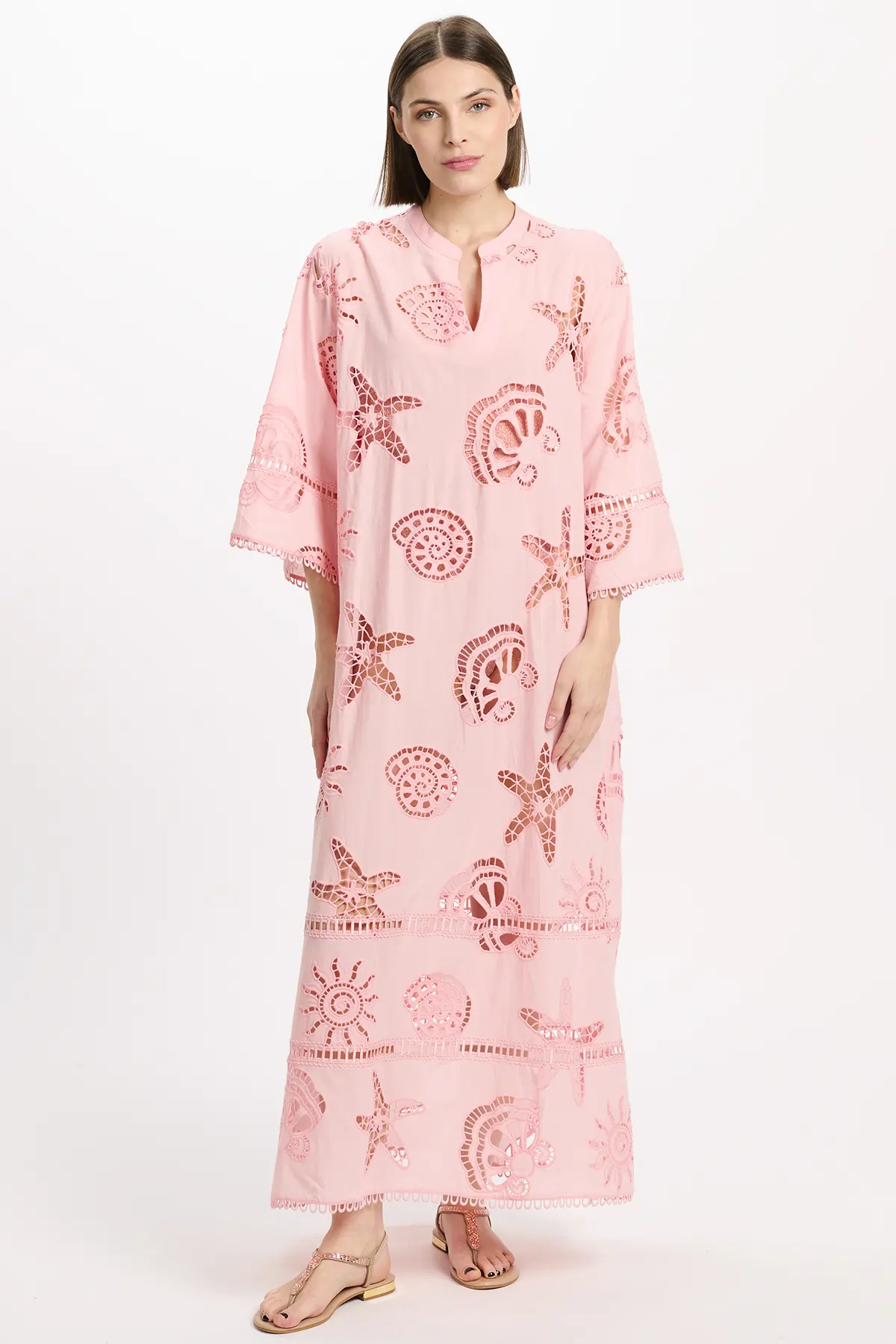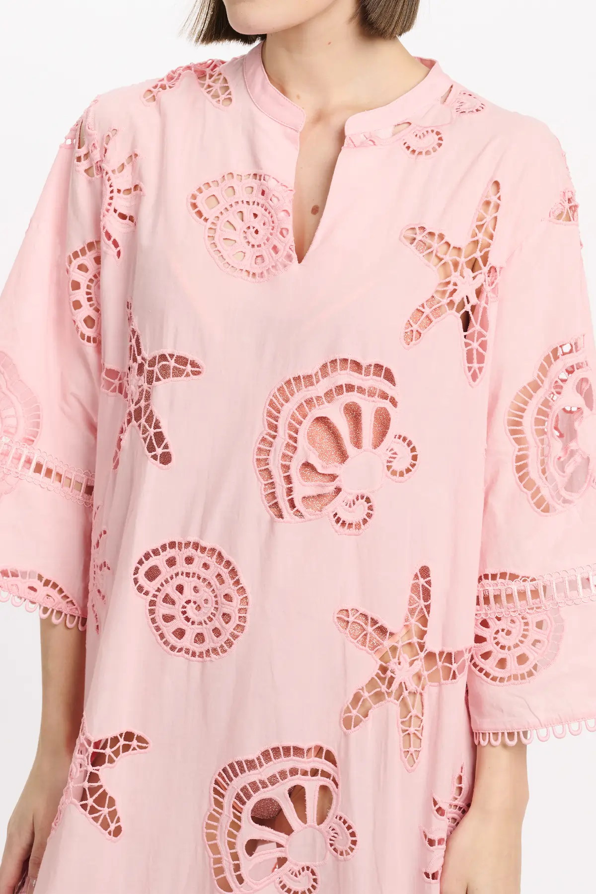 Zartes Rosa mit aufwendiger Cut-Out-Stickerei in maritimen Motiven wie Seesternen, Muscheln und Sonnen. Locker geschnittener Maxi-Silhouette mit halblangen Ärmeln, femininem Schlitz-Ausschnitt und dekorativen Borten am Saum. Die feine Lochstickerei verleiht dem Kleid eine besondere Leichtigkeit.