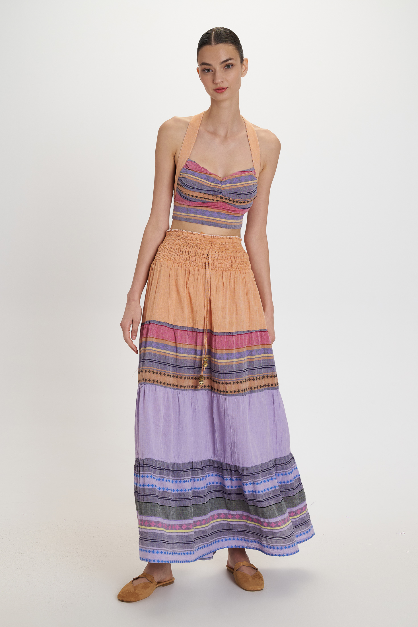 Mehrfarbiges Streifendesign in Flieder, Rosé, Blau und warmen Sandtönen mit feinen ethnischen Musterelementen. Der lange, fließende Rock verfügt über einen elastischen, gesmokten Bund mit dekorativem Bindeband und Quasten. Die mehrstufige Verarbeitung verleiht dem Rock eine schöne Bewegung und eine feminine Silhouette.