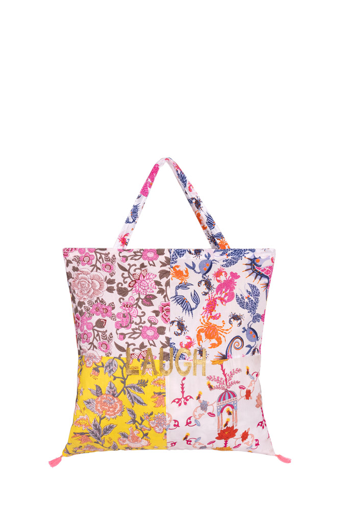 - Farbe & Details: Patchwork-Design aus verschiedenen floralen und ornamentalen Prints in Pink, Gelb, Grau und Blau. Aufgesetzter Schriftzug „LAUGH“ als positives Statement. Praktische Henkel zum Tragen über der Schulter oder in der Hand. Leicht und vielseitig kombinierbar.
