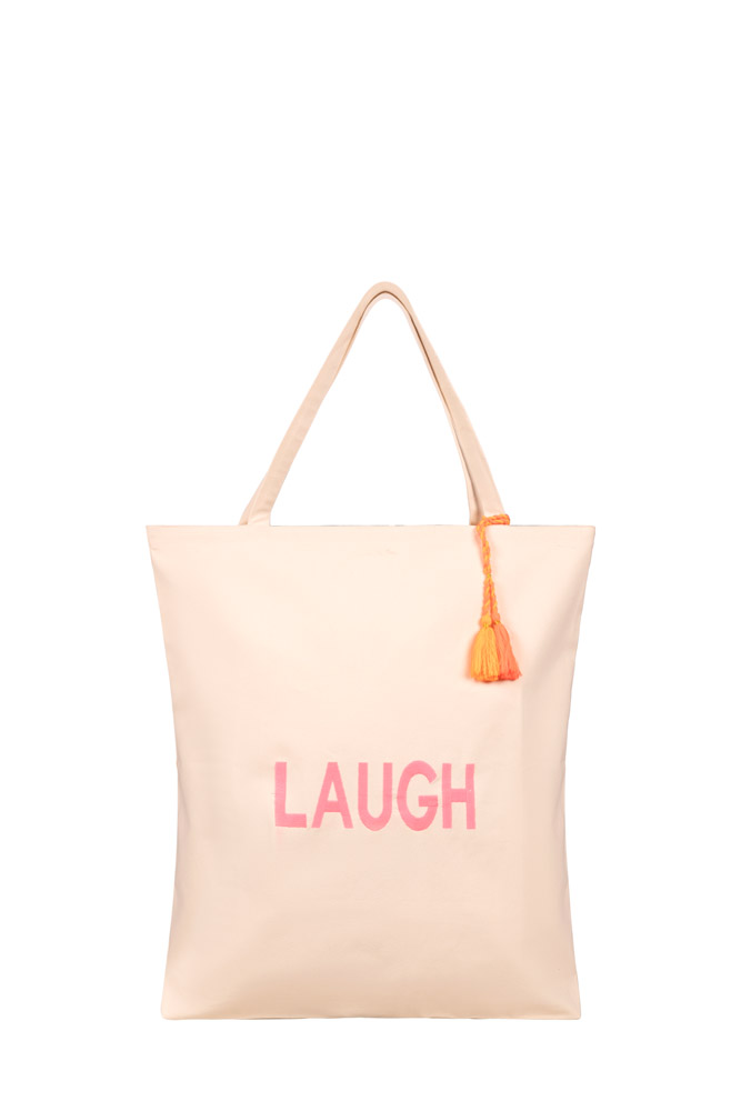 - Farbe & Details: Einfarbige Tote Bag in sanftem Creme-Ton mit kontrastierendem „LAUGH“-Schriftzug in Rosa. Dekorative Quaste in Orange als verspieltes Detail. Lange Henkel für bequemes Tragen über der Schulter.