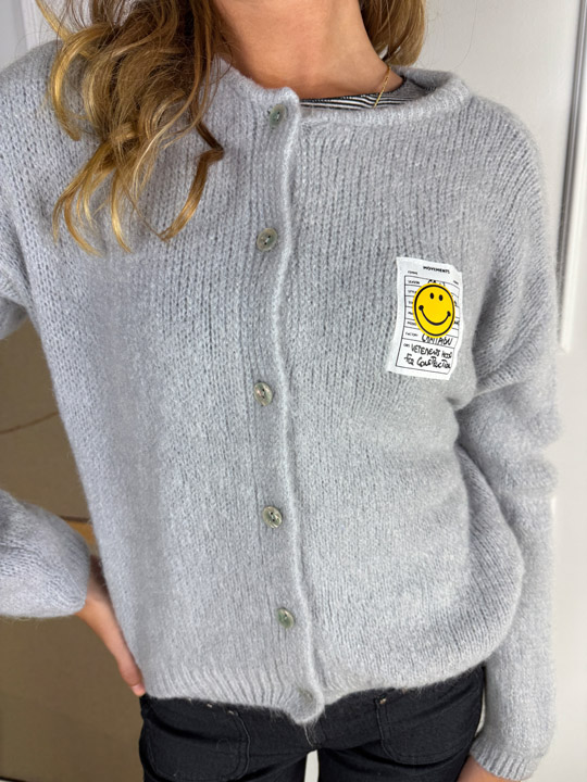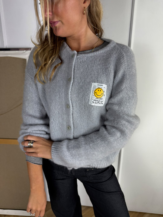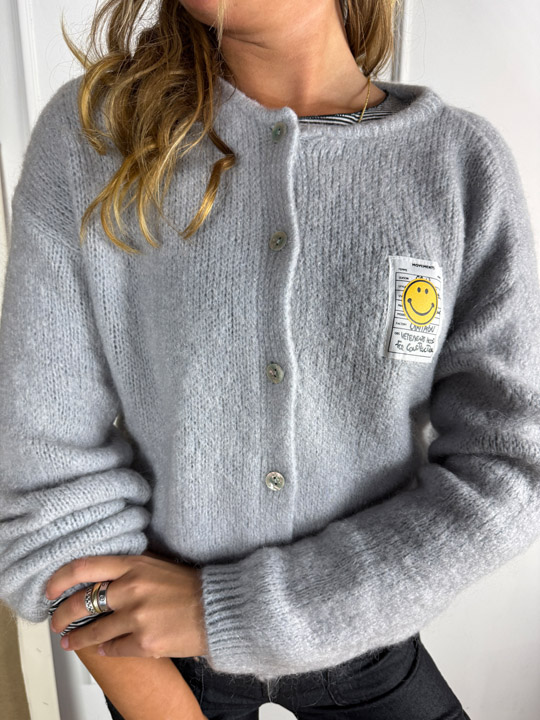 Grau melierter Kurz-Cardigan mit schimmernden Perlmutknöpfen, rundem Kragen und weichem Mohair-Mix – schlicht, modern und vielseitig kombinierbar. Das Smiley-Patch auf der Brusttasche bringt einen coolen, verspielten Akzent.