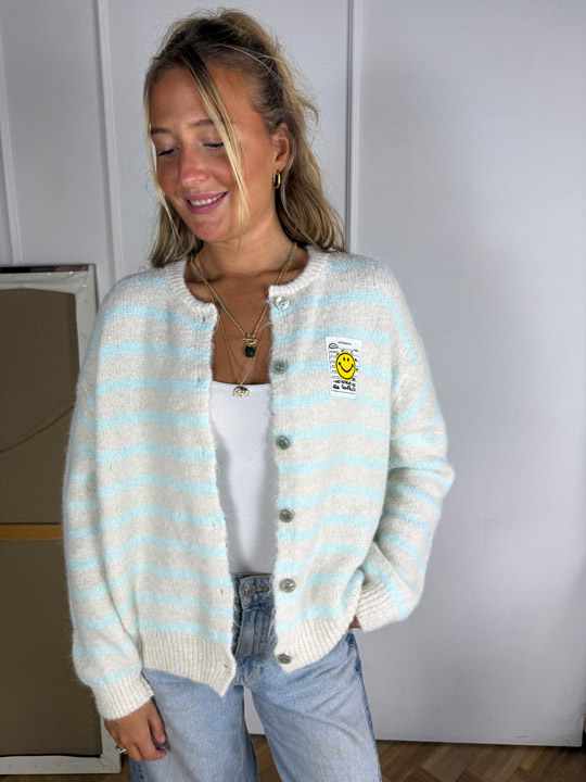 Gestreifter Kurz-Cardigan in Off White und Hellblau mit perlmuttschimmernden Knöpfen, rundem Kragen und weichem Material-Mix – auffällig, modern und vielseitig kombinierbar. Mit Smiley-Patch als Highlight.