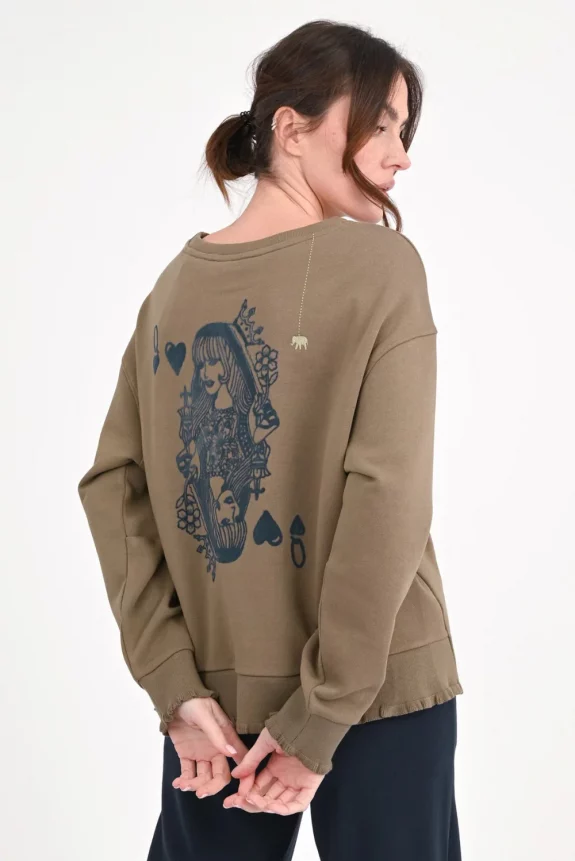 Das Barbuda Jersey von Love Joy Victory ist unser Lieblings-Basic-Sweatshirt mit besonderem Detail: Auf der Rückseite prangt ein künstlerischer Print der Spielkarten-Königin, der dem klassischen Pullover einen modernen, verspielten Akzent verleiht. - Der Rundhalsausschnitt und leicht überlappte Schultern sorgen für eine moderne Passform. Rüschendetails an Ärmeln und hinterem Saum verleihen dem Sweatshirt einen femininen, stilvollen Touch. Die kleine Elefantenstickerei auf der rechten Rückseite setzt ein dezentes Markenakzent.