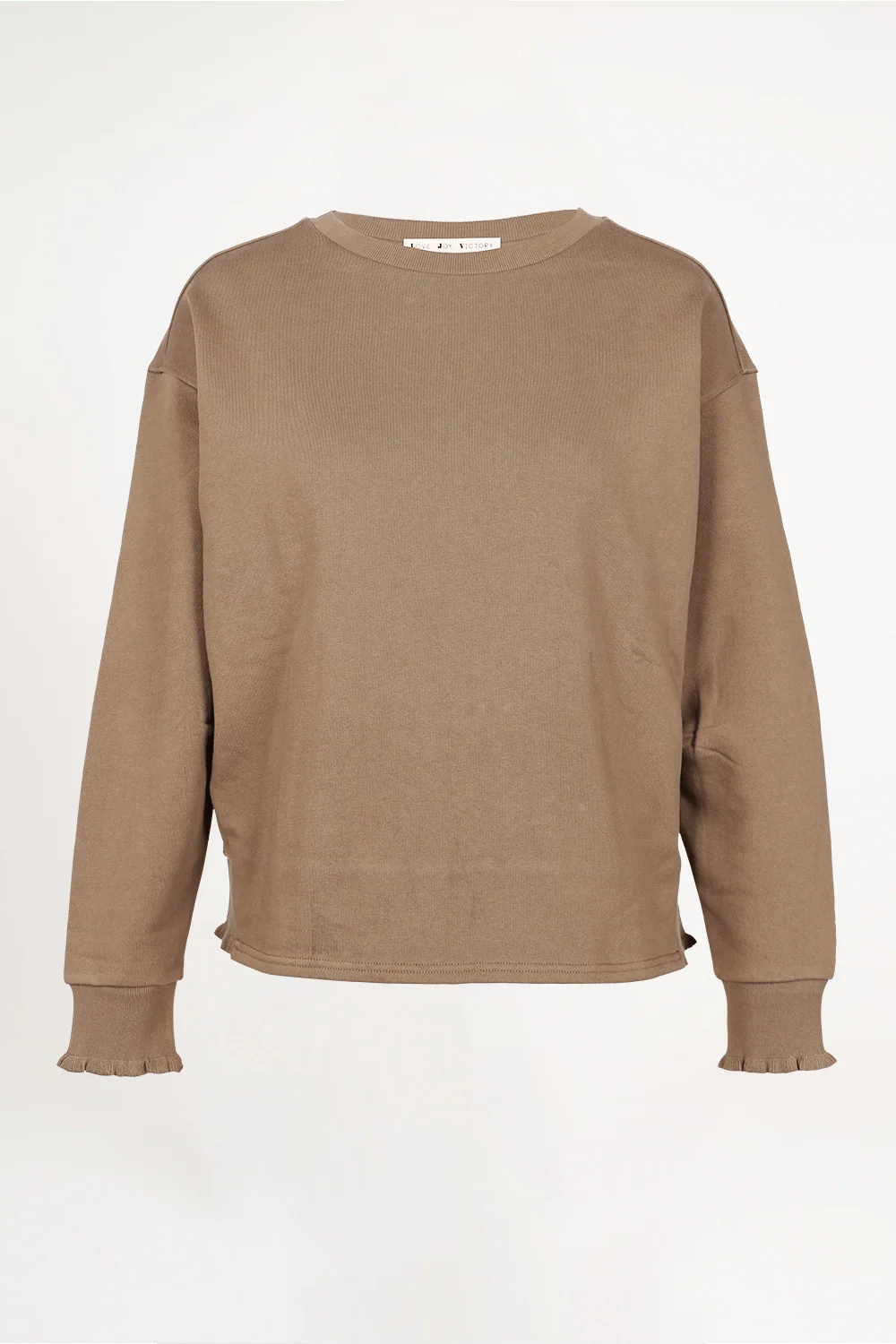 Lässiges Sweatshirt von Love Joy Victory aus 48 % Baumwolle, 48 % Modal, 4 % Elasthan mit Rundhalsausschnitt, leicht überlappenden Schultern, Rüschendetails an Ärmeln und Saum. Rückendruck „Spielkarten-Königin“ und kleine Elefantenstickerei auf der Rückseite.