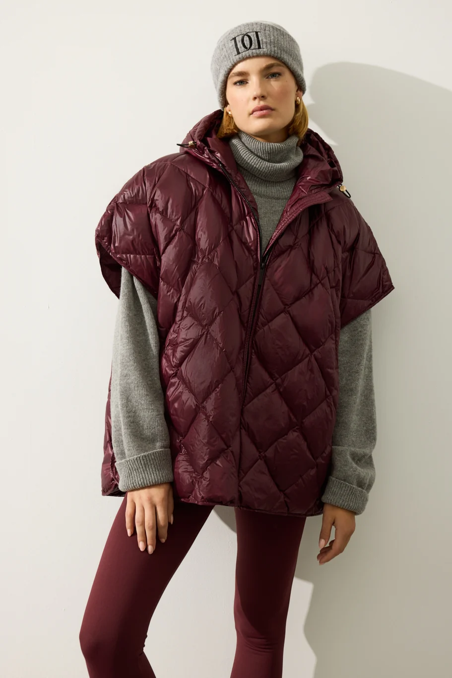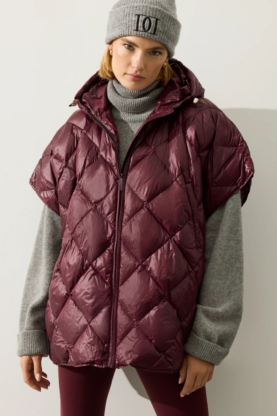 - Farbe & Details: In einem satten Bordeaux-Ton gehalten, überzeugt der Stevie Bodywarmer durch sein edles Diamant-Steppmuster und den feinen Glanz des hochwertigen Tech-Gewebes. Das Modell verfügt über einen Stehkragen, eine abnehmbare Kapuze, kurze Ärmel sowie einen Frontreißverschluss mit Kinnschutz. Schräge Eingrifftaschen und ein verdecktes Gummiband im Saum sorgen für Komfort und eine moderne Silhouette.