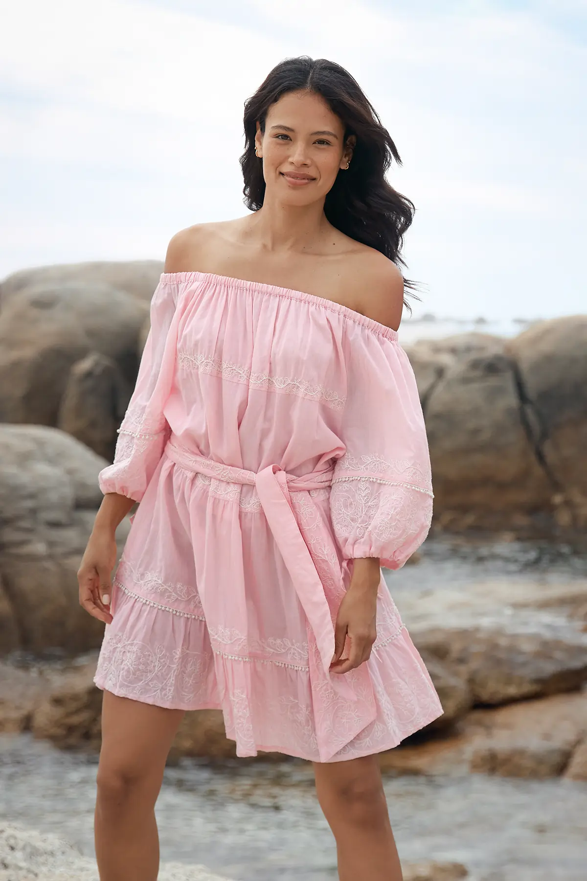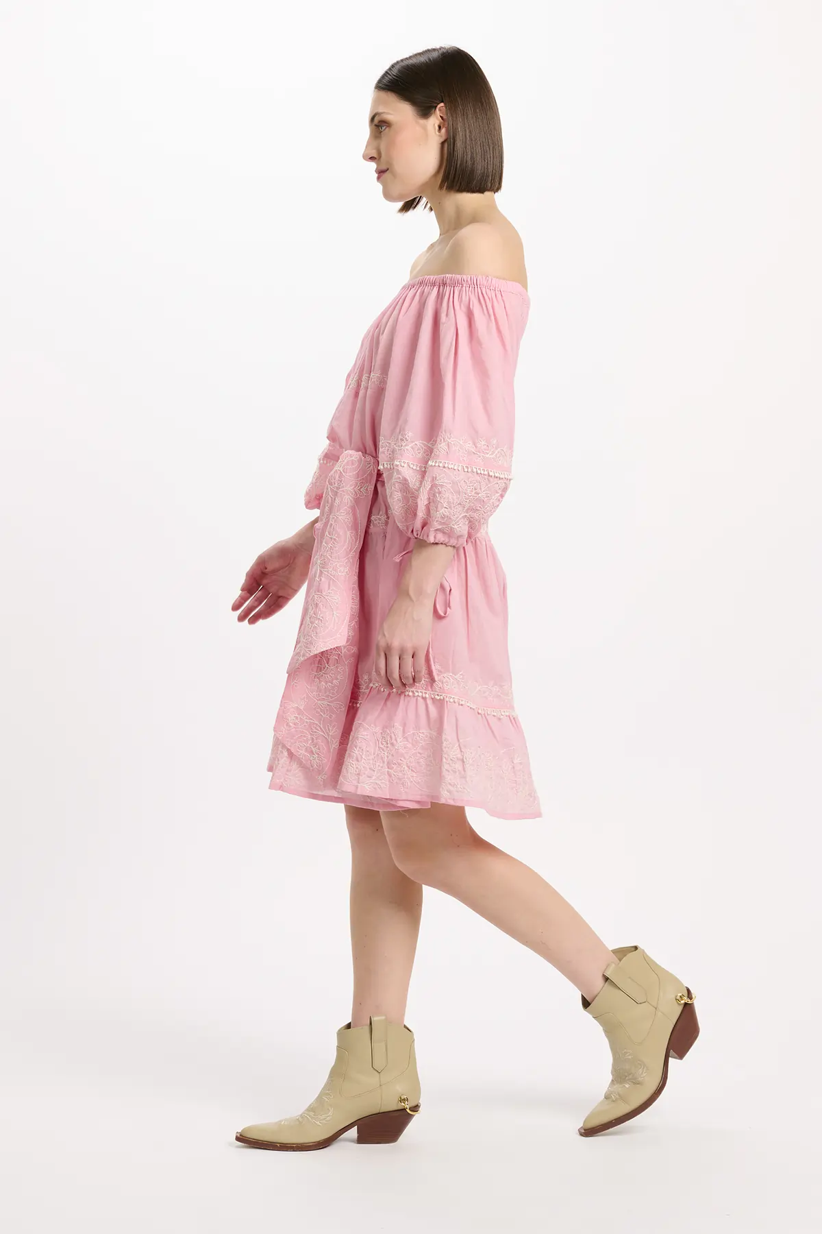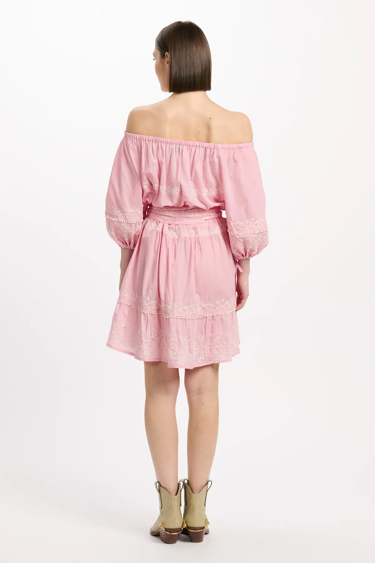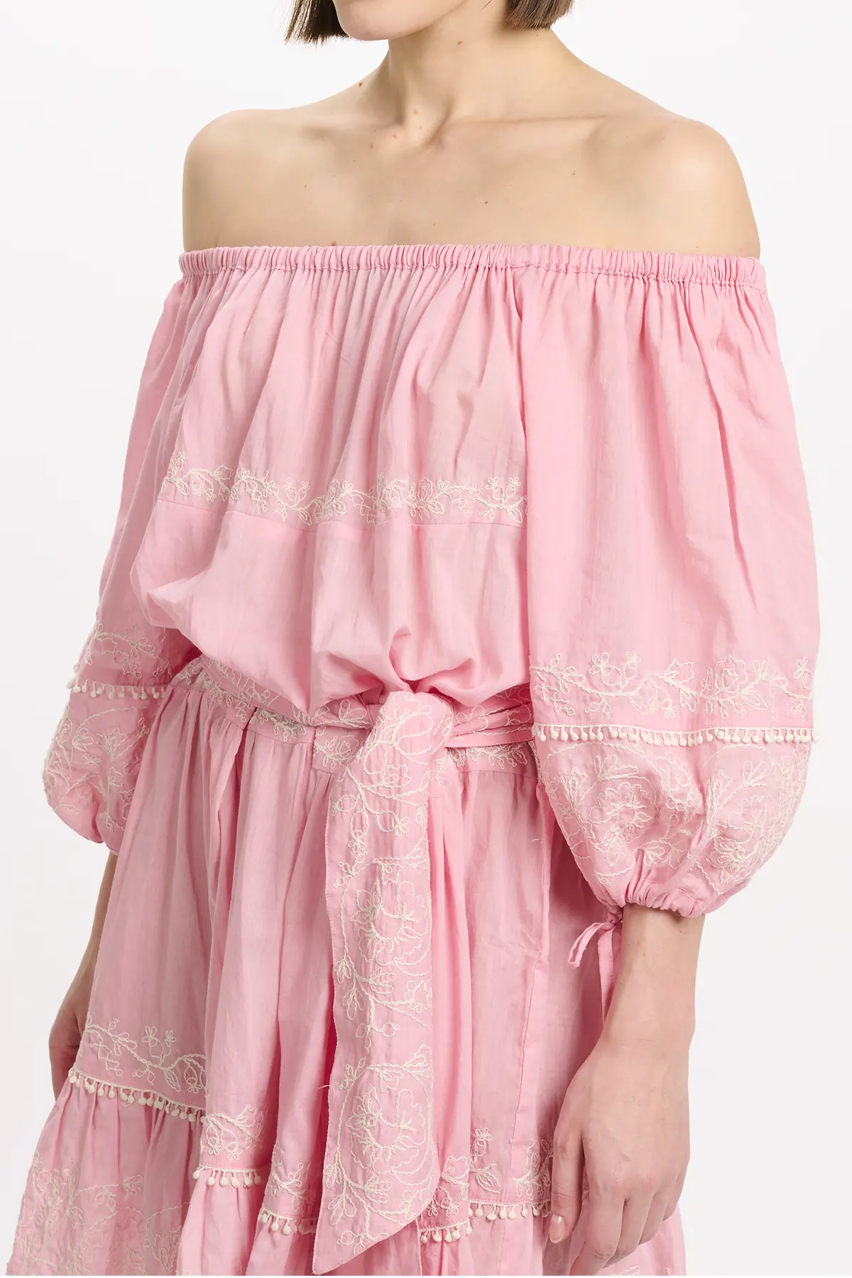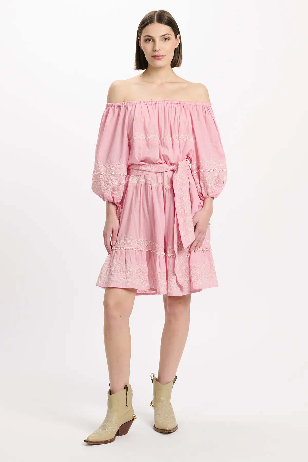 Zartes Rosa mit feinen Stickereien. Off-Shoulder-Ausschnitt mit elastischem Bund für einen femininen Look. Voluminöse 3/4-Ärmel, dekorative Stickdetails und ein abnehmbarer Bindegürtel auf Taillenhöhe sorgen für eine schmeichelhafte Silhouette. Der leicht ausgestellte Rock unterstreicht den verspielten Charakter.