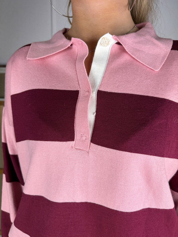 Gestreifter Pullover in Bordeaux & Rosa mit Reverkragen und kurzer Knopfleiste. Dünner Stoff – auch als Shirt tragbar. In S/M und M/L von Le Rose Paris.