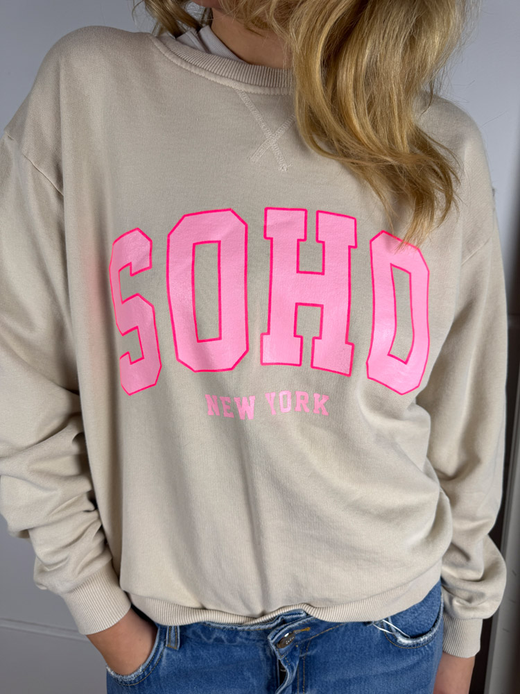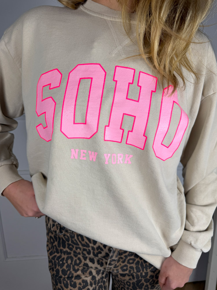 Soho Sweater – Beige mit rosa Aufschrift