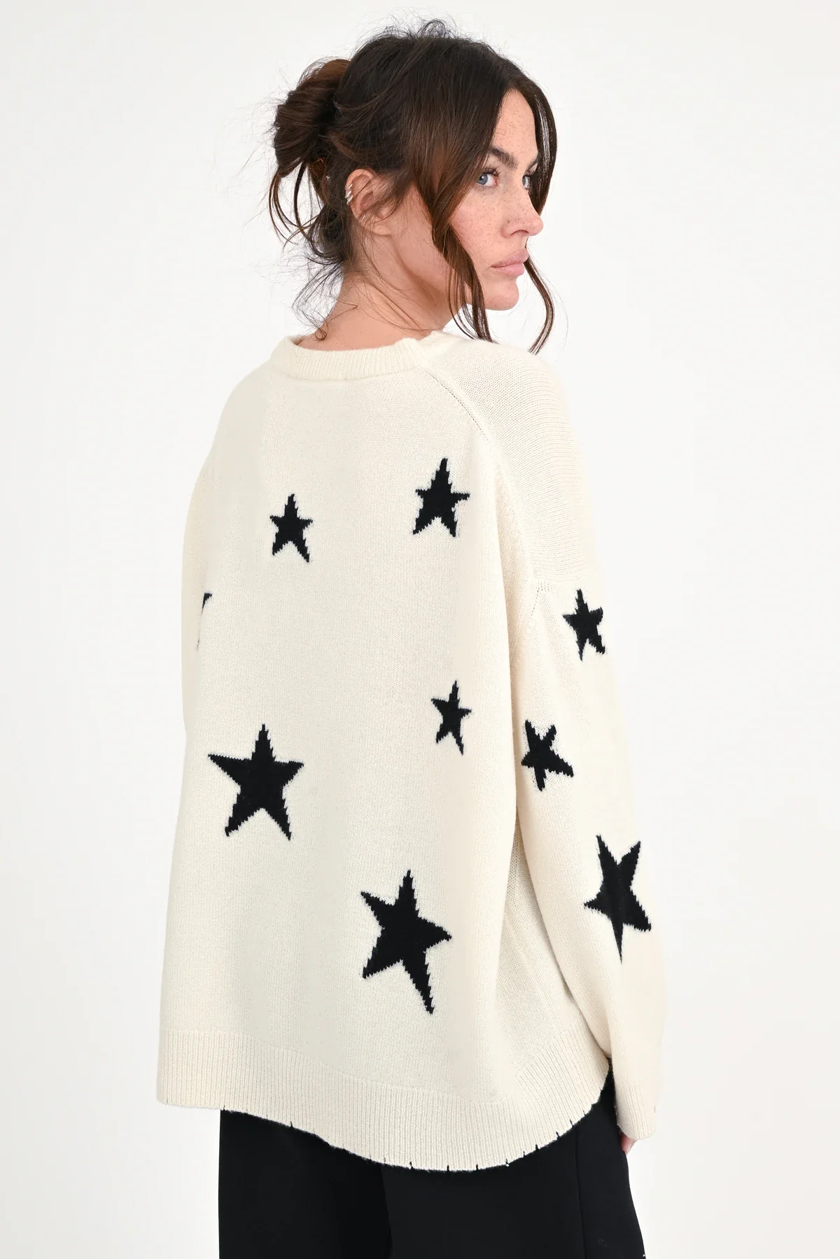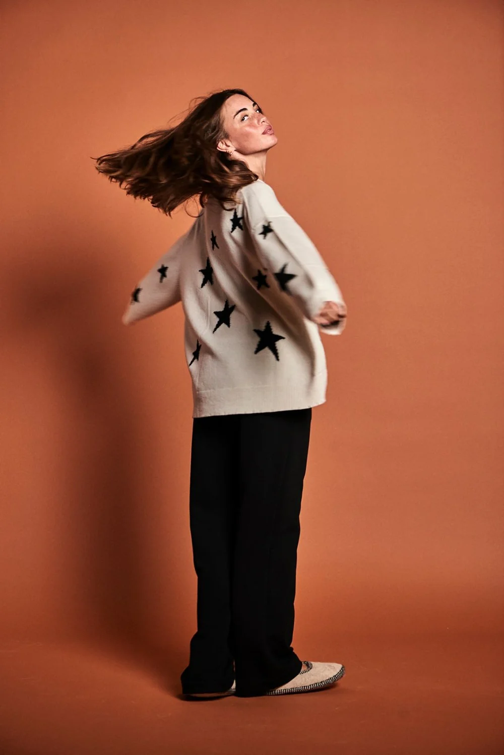 Der Star Cashmere Sweater Sweeny von Love Joy Victory vereint luxuriösen Komfort mit verspieltem Design. Der besonders weiche Cashmere-Strick fühlt sich angenehm auf der Haut an, während die schwarzen Stern-Applikationen in unterschiedlichen Größen einen modernen, grafischen Akzent setzen.