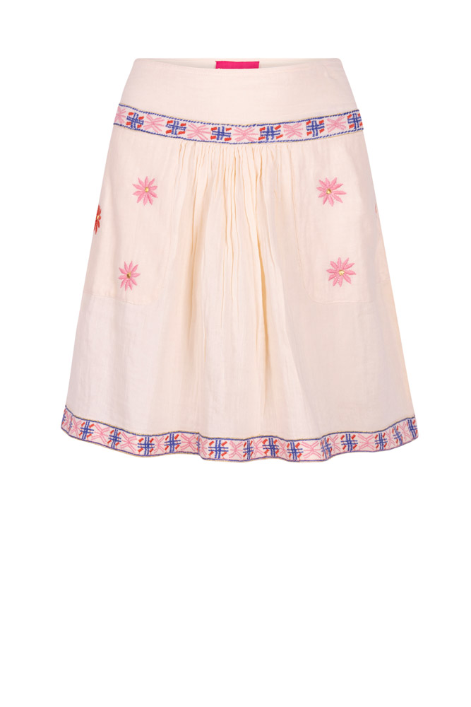 - Farbe & Details: Zarter Creme-Ton mit feiner, handgearbeiteter Blumenstickerei in Rosa. Bestickter Bund mit dekorativem Muster in Pink und Blau. Leicht ausgestellter Schnitt mit feiner Bordüre am Saum. Dezente Falten sorgen für einen femininen Fall.