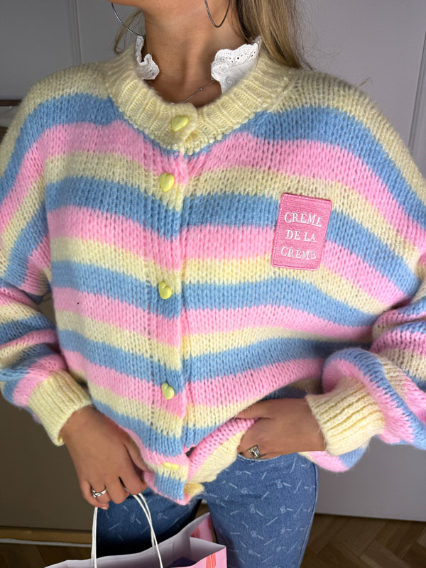 Bunter Oversize-Cardigan mit Blockstreifen in Gelb, Blau und Babyrosa. Runder Ausschnitt, rosa Herzknöpfe und ein „Crème de la Crème“-Patch verleihen dem Modell einen modernen, femininen Look.