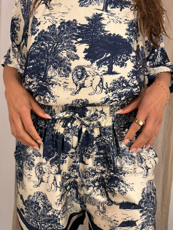 Hose von Le Rose Paris mit feinem Toile-de-Jouy-Druck – luftig, stilvoll und ideal für warme Sommertage.