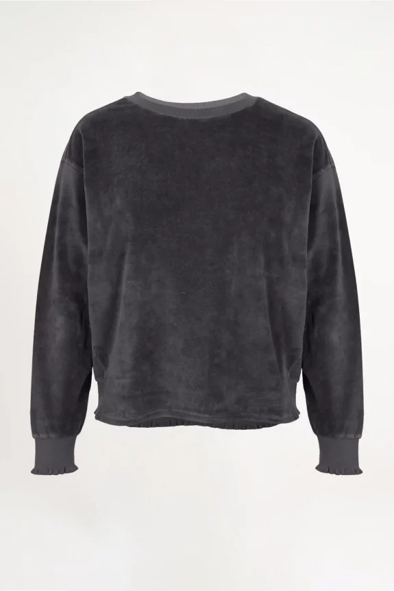 Figurbetontes Sweatshirt aus weichem French-Terry-Samt mit Rundhalsausschnitt, leicht überschnittenen Schultern und Rüschendetails an Ärmeln und Rückensaum. Mit kleiner Elefantenstickerei auf der Rückseite.