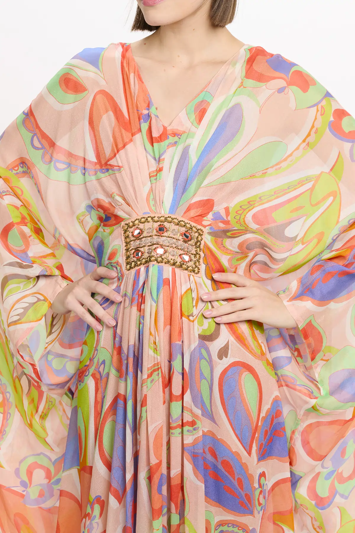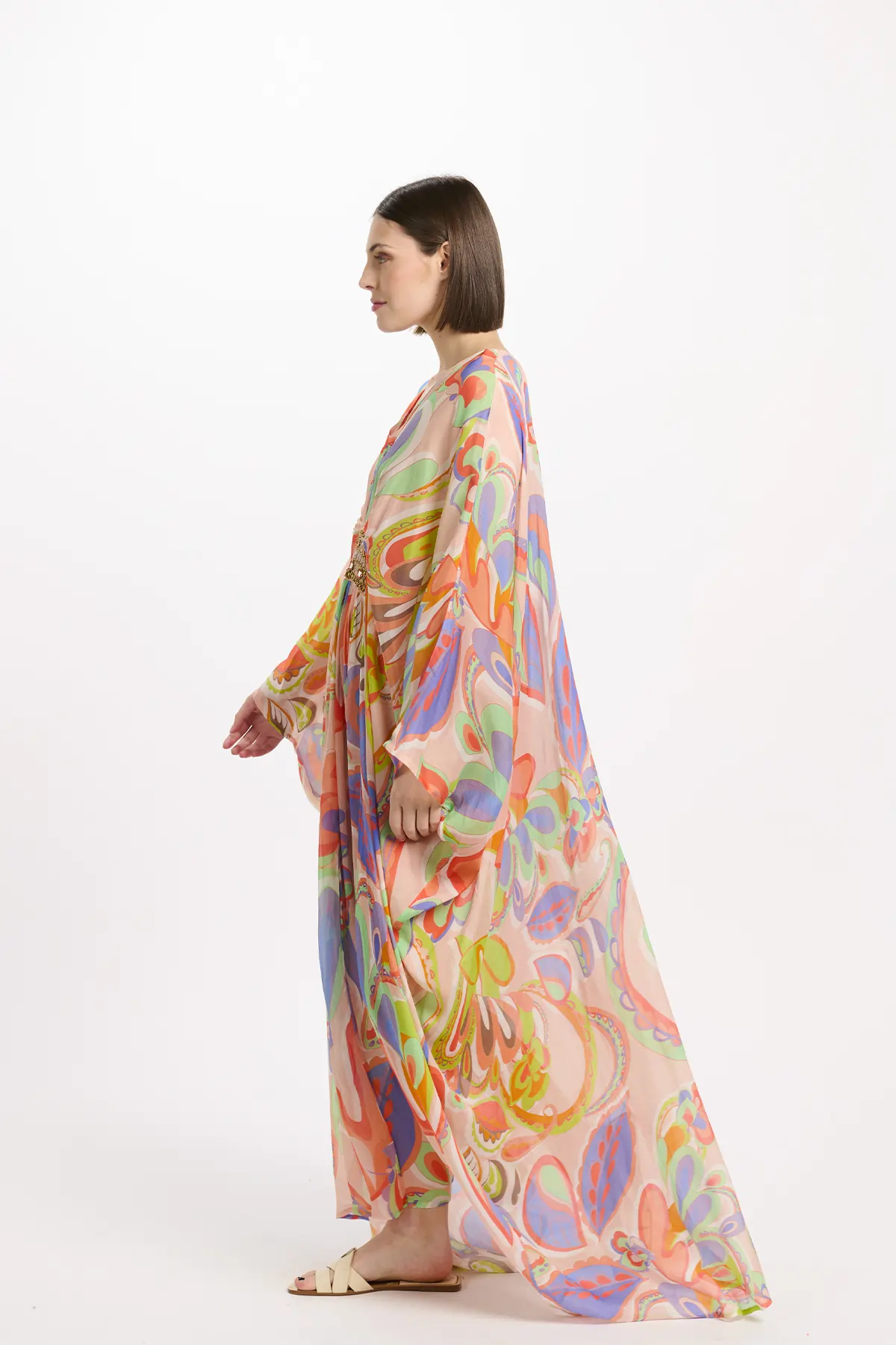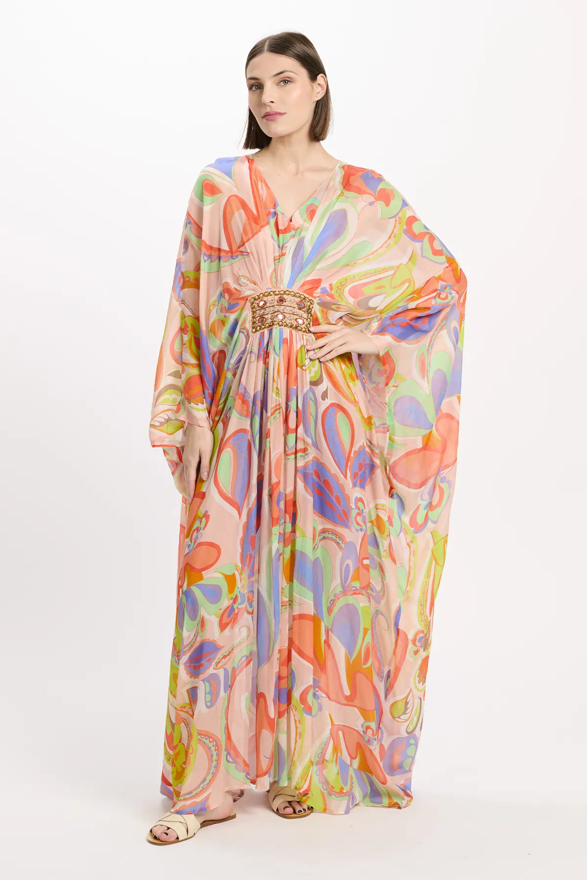 Farbe & Details: Ausdrucksstarker Paisley-Allover-Print in leuchtenden Pfirsich-, Orange-, Grün- und Blaunuancen auf hellem Grund. Eleganter Farasha-Schnitt mit großzügigen, majestätischen Schmetterlingsärmeln. Aufwendig besticktes Schmuck-Plastron an der Taille setzt einen edlen Akzent und betont die Silhouette auf besondere Weise.