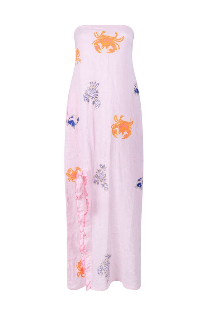 • Farbe & Details: Zartes Rosé mit verspieltem Allover-Print aus Krabben- und Ananasmotiven in Orange, Blau und Naturtönen. Trägerloses Bandeau-Design mit elastischem Abschluss für sicheren Halt. Seitlicher Schlitz mit dekorativer Rüsche in Pink sorgt für feminine Bewegung und sommerlichen Akzent. Locker fallender, fließender Schnitt.