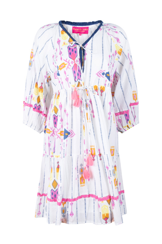 Farbe & Details: Heller Grundton mit detailreichem Ornament-Print in Pink-, Blau- und Gelbtönen. Der V-Ausschnitt mit Bindeband und Quasten setzt einen verspielten Akzent. Kontrastierende Zierborten in Pink entlang der Ärmel und der Stufen verleihen dem Kleid einen femininen, lebendigen Look.