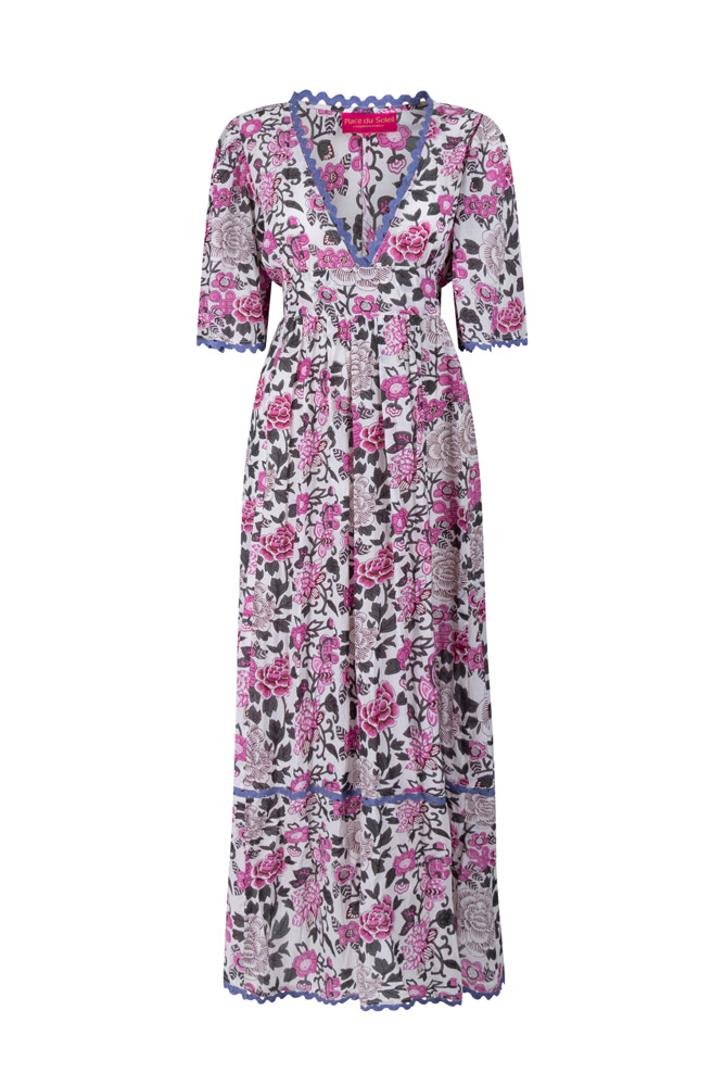 - Farbe & Details: Weißer Grundton mit ausdrucksstarkem floralem Allover-Print in Pink-, Grau- und Blautönen. Femininer V-Ausschnitt mit dekorativer Bordüre. Halbarm mit feiner Zierkante. Taillierung unter der Brust für eine schmeichelhafte Silhouette. Fließender Maxischnitt mit dekorativer Bordüre am Saum.